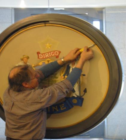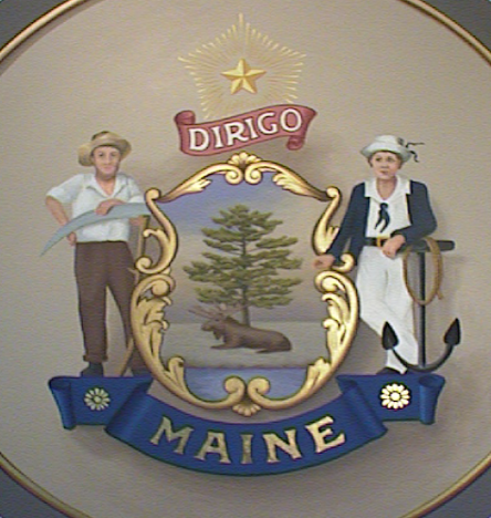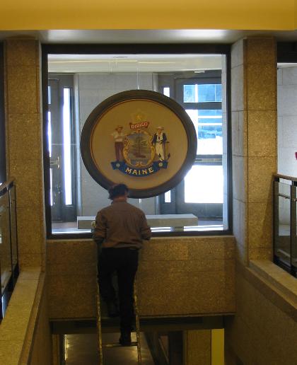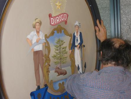 This State Seal was painted on canvas and glued to a wooden disk. It is held in a metal frame in the center of a glass wall in the State House entryway in Augusta, Maine. There are actually two seals, one on each side of the disk. The gilded bead at the edge near the frame is trompe l'oeil.